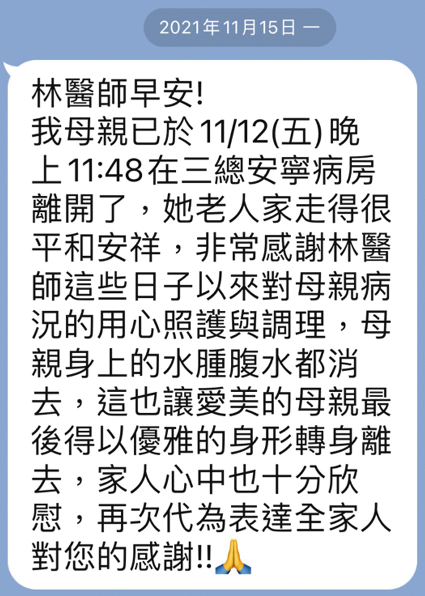 至11月初,顏女士變地不想吃東西,人也開始虛弱,大部分的時間都在昏睡。11月10日上午,女兒至張平穎醫師門診告知上述情形後,安排顏女士於當日晚上住院打點滴補充營養與水分;至11月12日晚上,顏女士在安寧病房於睡夢中過世。我於15日收到顏女士女兒來訊(圖二)。身為醫者,得知能協助顏女士可以優雅的身形離世,並且在生命最後的旅程,不需頻繁進出醫院以抽腹水方式來緩解腹脹,讓病人與家屬得以減少時間、體力的消耗,內心著實感到欣慰!